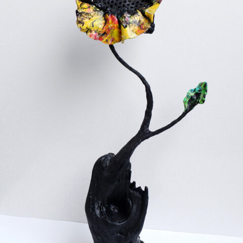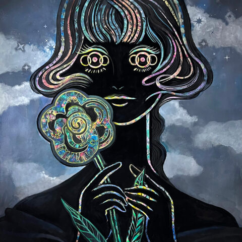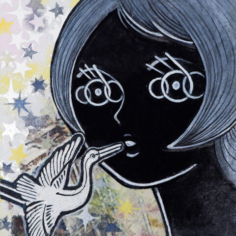 黒を基調に描かれた人物や植物、そして「はなまる」は、存在の意味を問いかける静かな声です。